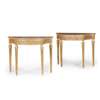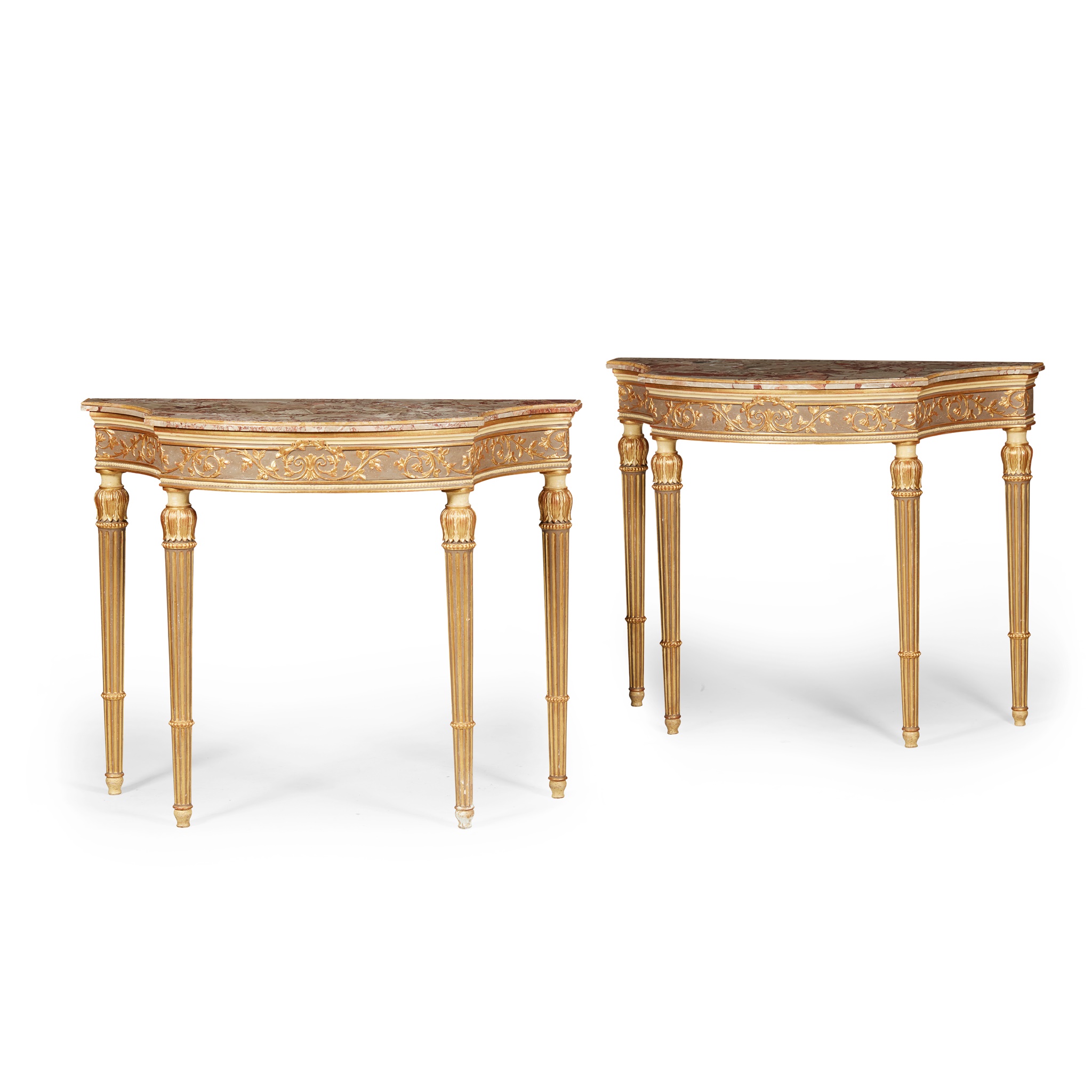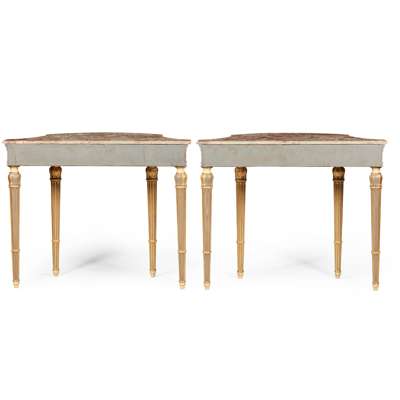 PAIR OF GEORGE III STYLE PAINTED AND GILT MARBLE TOPPED CONSOLE TABLES
