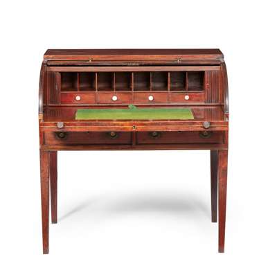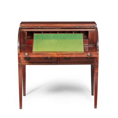 LATE GEORGE III MAHOGANY TAMBOUR TOP BUREAU Y