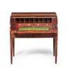 the tambour top opening to further tambour doors enclosing pigeon holes and drawers with ivory knobs, over a pull-out slide with ratchet-adjusted baize lined slope, above a pair of short drawers and raised on square tapered legs