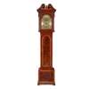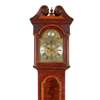 the swan neck pediment above and arched brass dial with signed boss, the silvered chapter with Roman numerals, subsidiary seconds dial, date aperture, and twin winding holes, above an arched crossbanded trunk door above a banded plinth on bracket feet; the eight day movement striking a bell