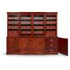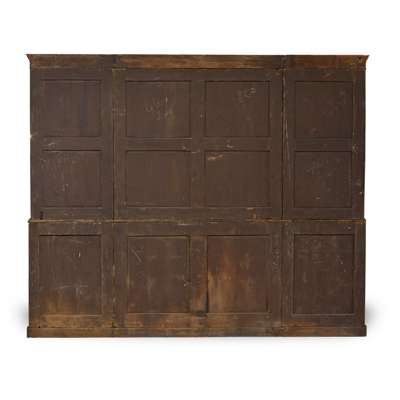 the moulded cornice above a pair of astragal glazed doors flanked by further doors, all enclosing adjustable shelves; on a base with four moulded panel doors, the centre doors enclosing sliding trays, the outer doors enclosing drawers to one side and shelves to the other, on a plinth base