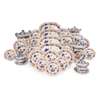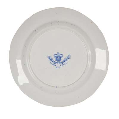 comprising a large soup tureen and cover; two further tureens with covers and circular stands; two small sauce tureens with covers on circular stands; two round basins; a tree and well meat plate and a meat drainer; seven various graduated ashets, the largest 54cm long, the smallest 26.5cm long; thirty two dinner plates, 24.7cm diam.; eight bowls, 24cm diam.; six side plates, 19cm diam.; underglaze blue Stone China crown and laurel wreath mark, pattern No 6