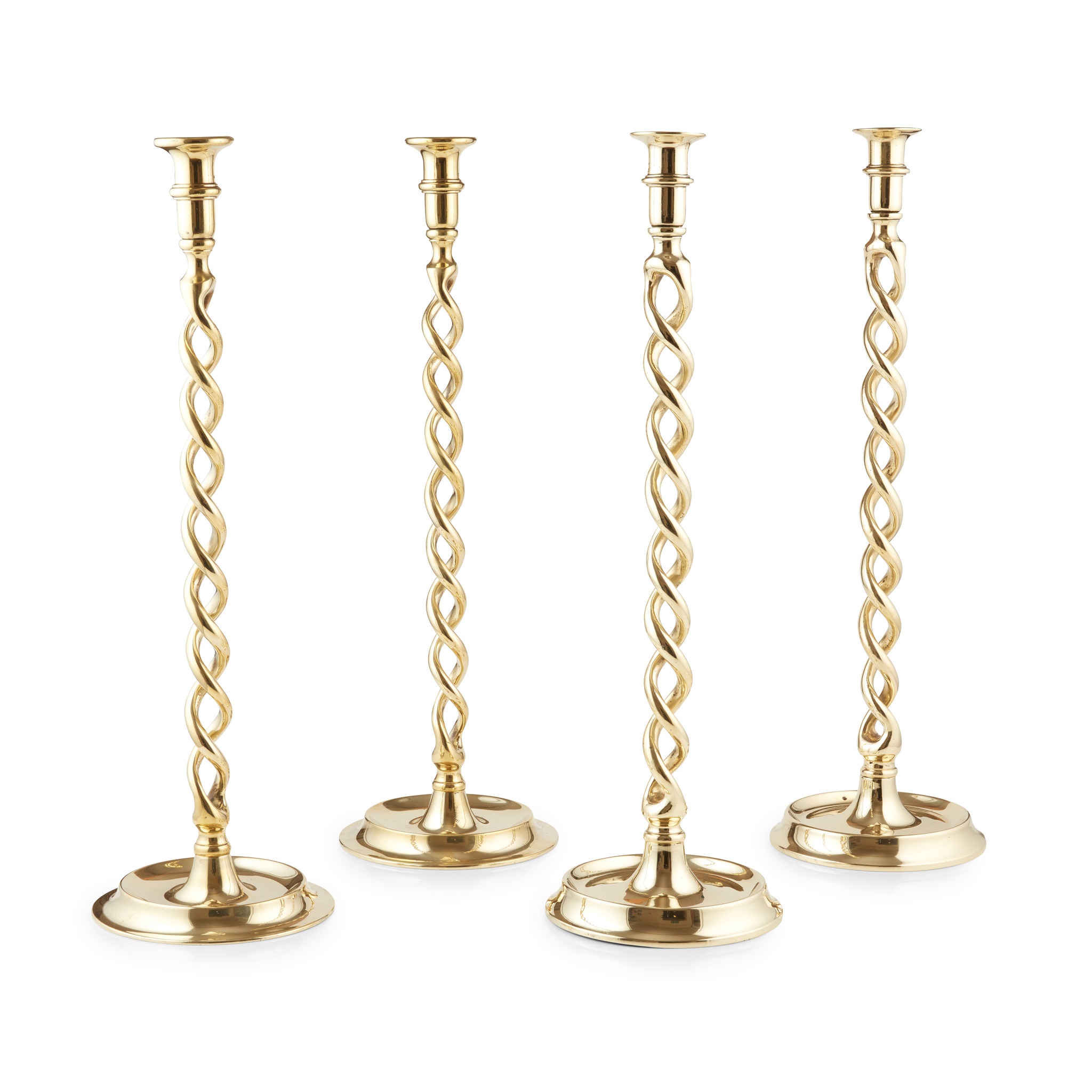 FOUR LARGE EDWARDIAN BARLEY TWIST BRASS CANDLESTICKS