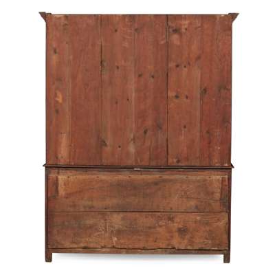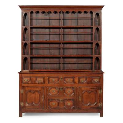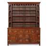the moulded cornice above four enclosed plate shelves flanked by arched recesses; the base with an arrangement of fielded panel doors and drawer, on stile feet