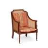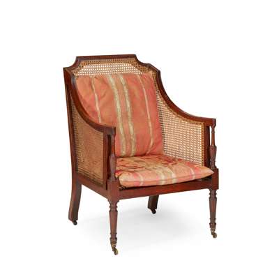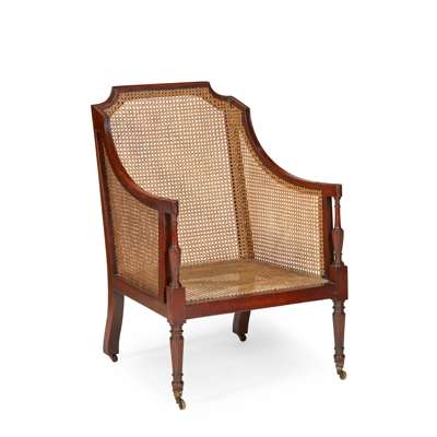 the caned shaped square back above a cushion seat flanked by enclosed sides with baluster column supports, raised on turned and tapered legs ending in castors