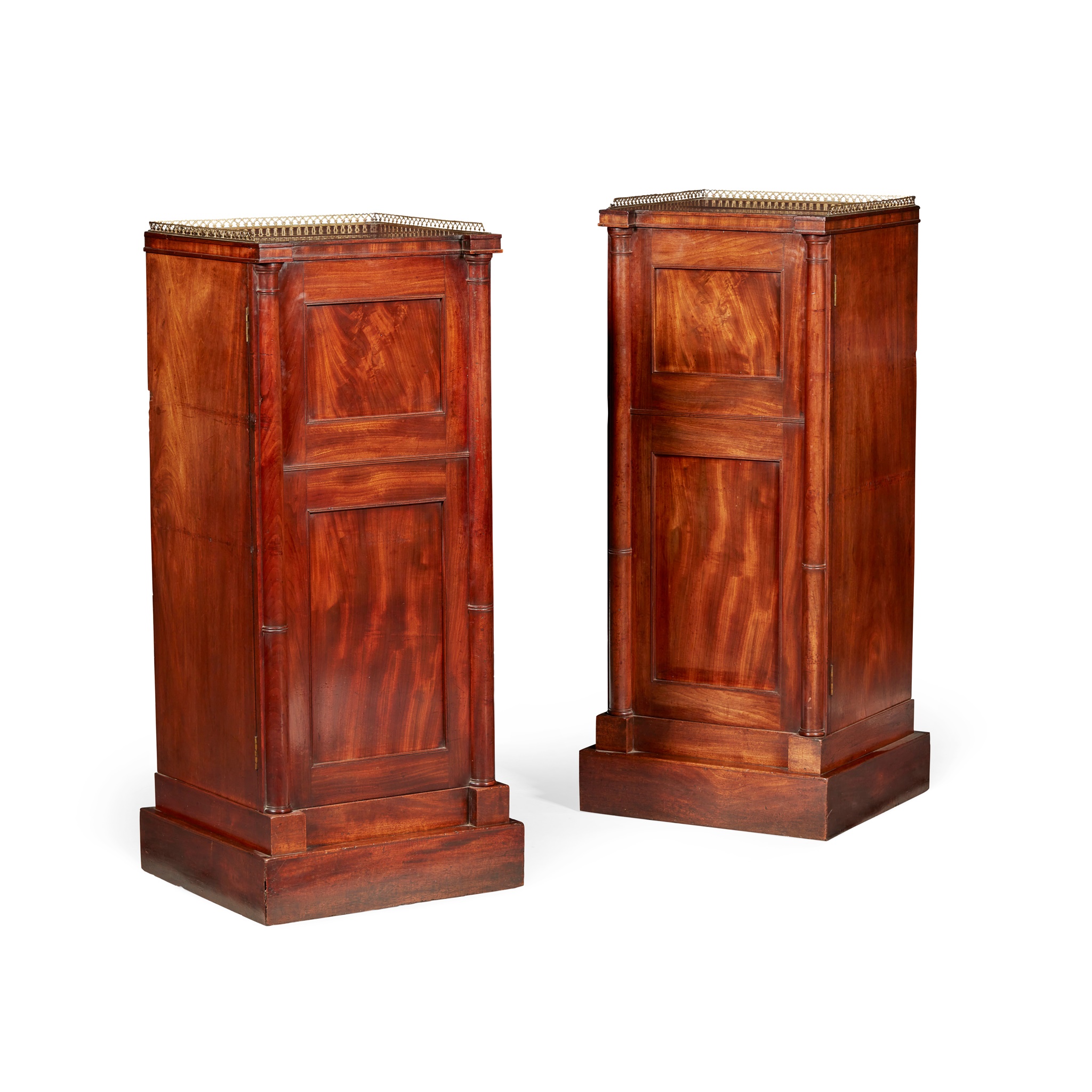 with pierced brass galleries above moulded panel doors flanked by pilasters, opening to shelves and an interior drawer, on plinth bases with brass castors