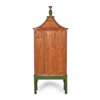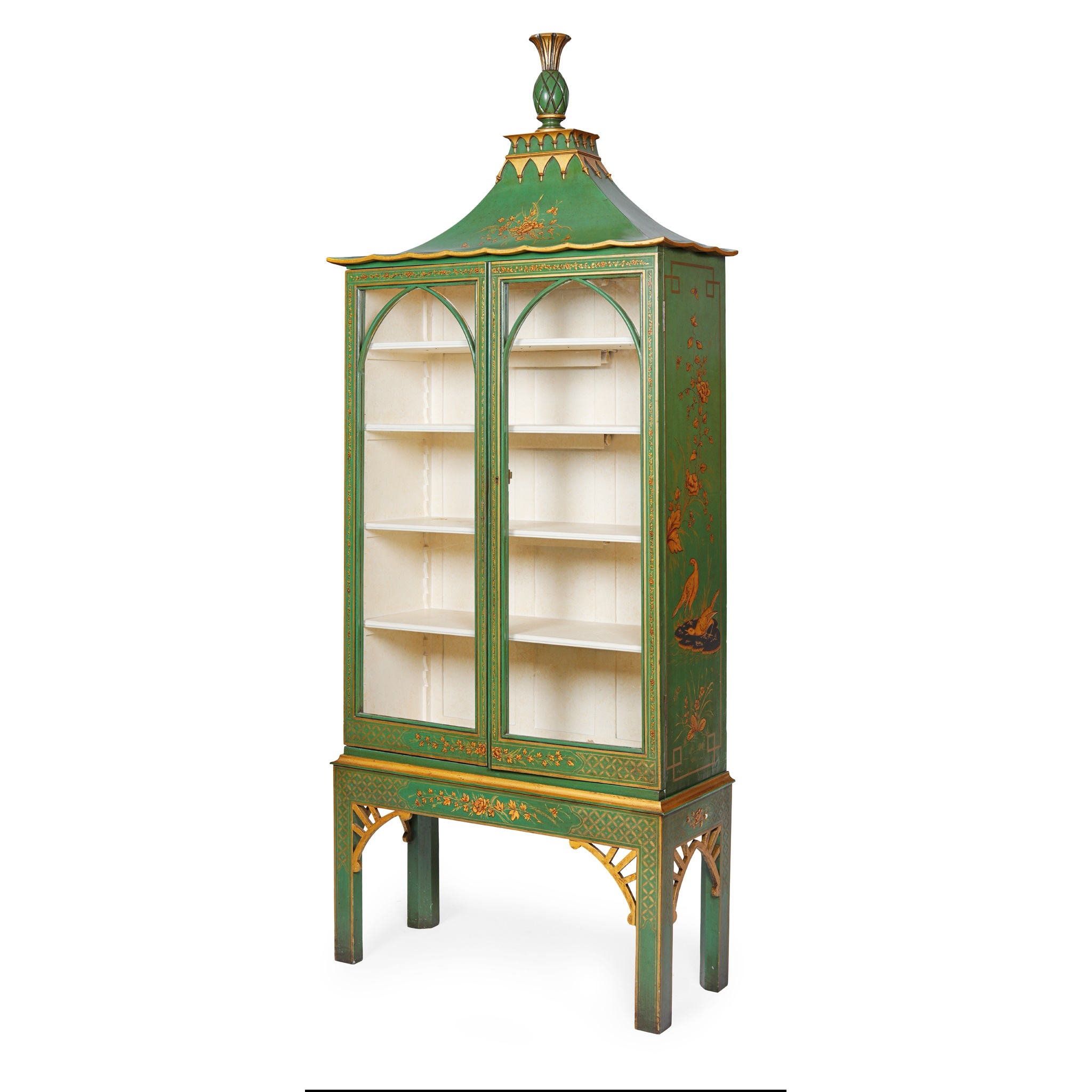 the pagoda top with a pineapple finial, above a pair of glazed doors enclosing four shelves, on straight legs with pierced spandrels, decorated to simulate Chinese lacquer