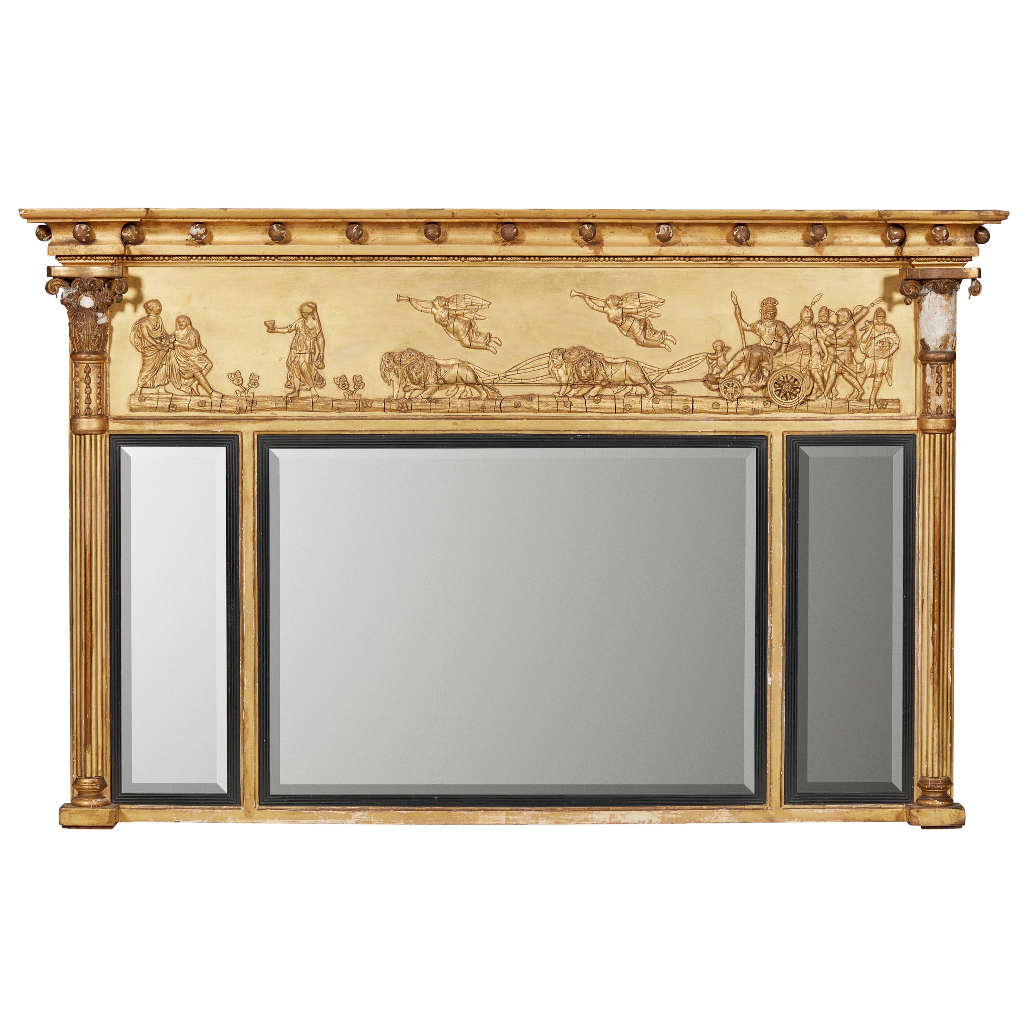 the moulded cornice with ball mounts above a frieze depicting Apollo in a chariot pulled by lions, over bevelled mirror plates in ebonised slips flanked by reeded columns
