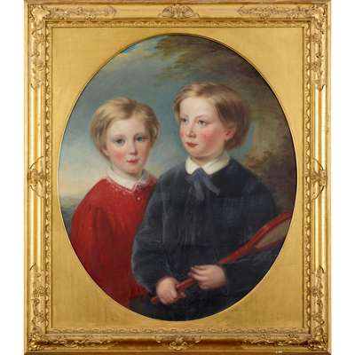 PORTRAIT OF TWO BOYS, ONE HOLDING A TENNIS RACQUET