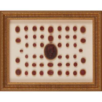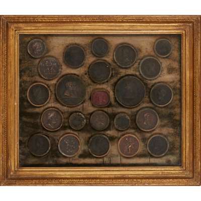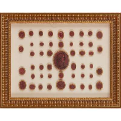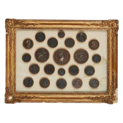 to include two groups in red wax mounted with matching frames; a group of 'bronzed' examples mounted in a giltwood frame, frame 34.5cm x 46cm; and another group mounted in a giltwood frame, frame 34.5cm x 40.5cm