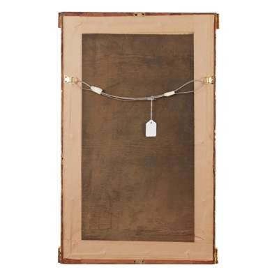 the verre églomisé frieze painted with flowers and a musical trophy; over a rectangular mirror plate flanked by columns