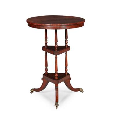 the circular top on turned supports over two further triangular tiers, raised on splayed tripod legs with brass paw caps and castors