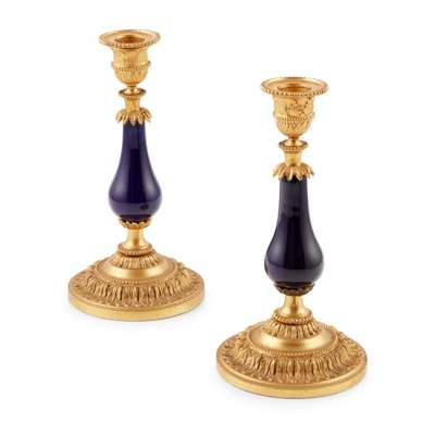 PAIR OF REGENCY GILT BRONZE AND ENAMEL CANDLESTICKS
