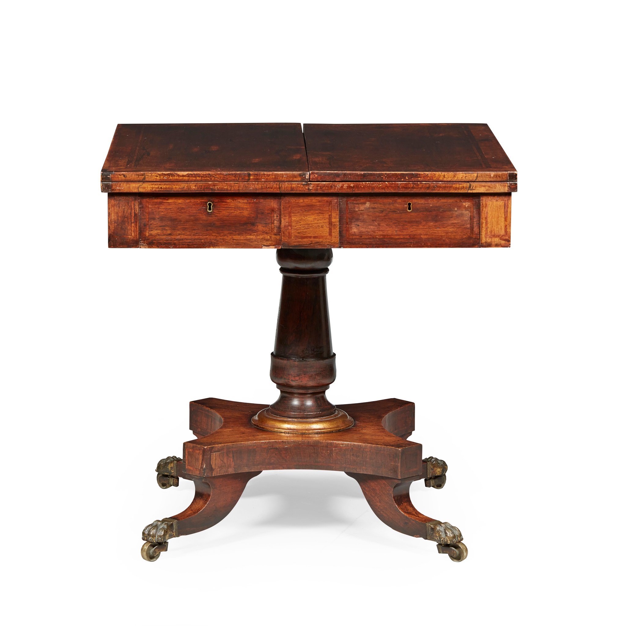 the banded top with hinged inward-closing leaves above a real and dummy drawer to each side, raised on a tapered hexagonal column support and quadripartite base with sabre legs ending in brass claw feet with castors