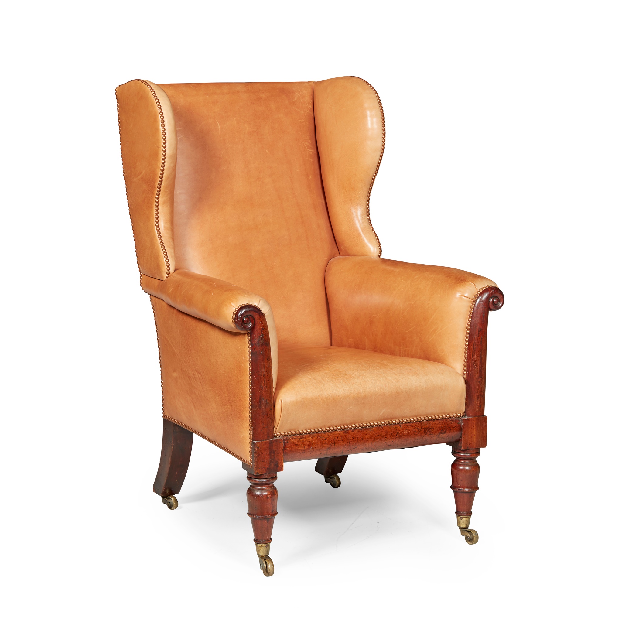 WILLIAM IV MAHOGANY LEATHER UPHOLSTERED WING ARMCHAIR