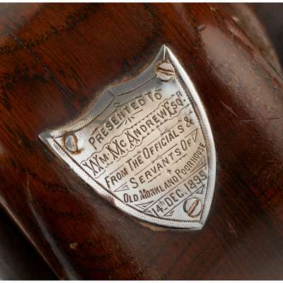 with a presentation plaque 'PRESENTED TO WM. MCANDREW ESQ.R/ FROM THE OFFCIALS & SERVANTS OF OLD MONKLAND POORHOUSE/ 14TH DEC. 1895', with a leather covered beater