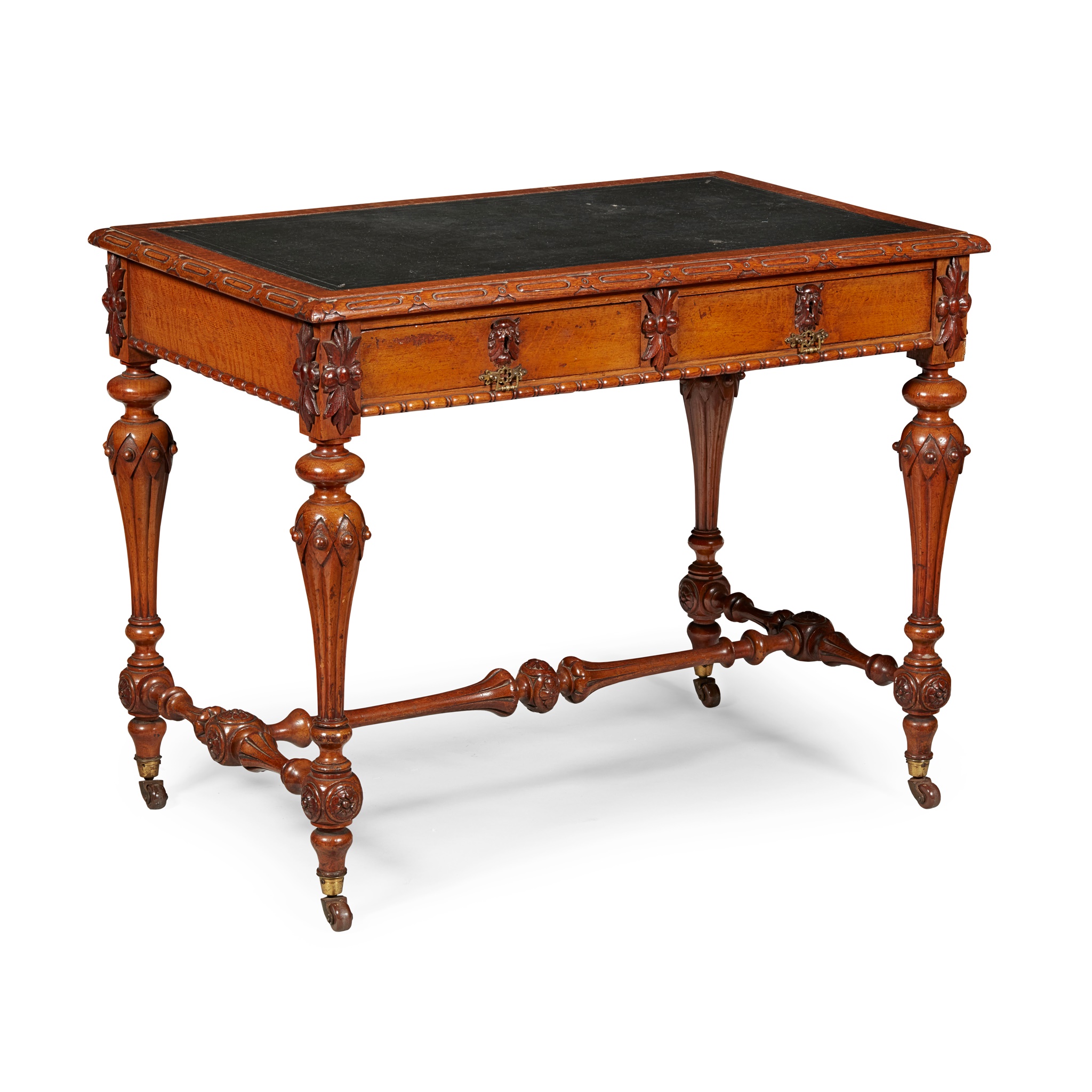 the top with a black insert writing surface and bead moulded edge, above two short frieze drawers, raised on turned, beaded, and reeded moulded tapered legs joined by a turned and carved H stretcher, on brass caps and ceramic castors