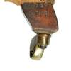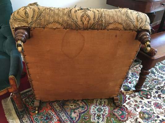 the arched button-upholstered back above a deep seat flanked by padded open arms with turned supports, raised on turned legs with brass castors, the rear leg stamped 10067/ 0559; covered in an Art Nouveau pattern fabric