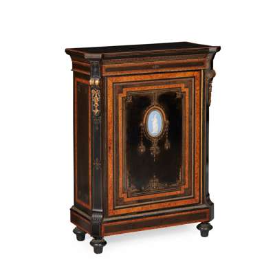 VICTORIAN AMBOYNA, EBONISED, JASPERWARE MOUNTED SIDE CABINET
