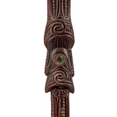 wood and shell, carved throughout with notched detailing of scrolls and waves, with a series of five tiki running along the shaft, each inlaid with pāua shell eyes