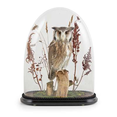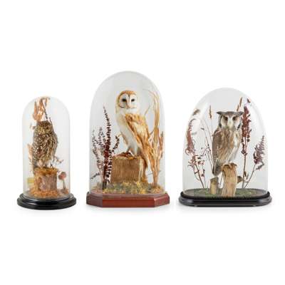 THREE DOME-CASED TAXIDERMY OWLS Y