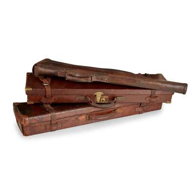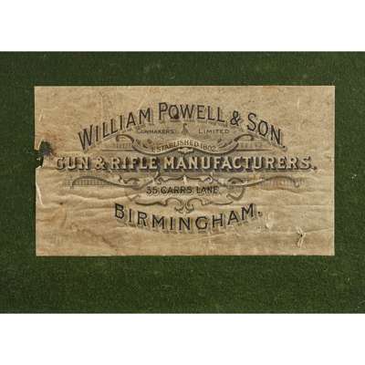 to include a case with trade label for Robert Adams, 76 King William Street, London, 76cm long; another similar with trade label for William Powell & Son, 35 Carrs Lane, Birmingham, 83cm long; and a leg of mutton case, 81cm long