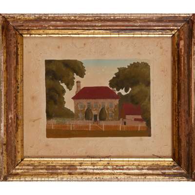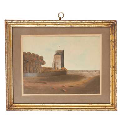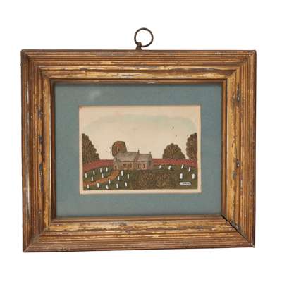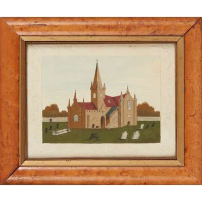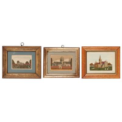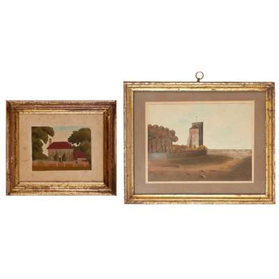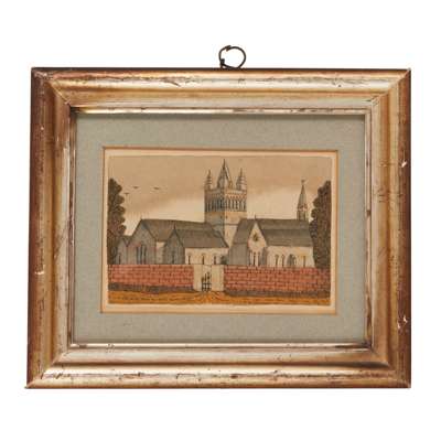 including Whippingham Church and St Lawrence Church, with labels for Albert E. Neat; a further church with labels for J. Pinhorn and Victor Mahy; a large example depicting St Helens Old Church, near Bembridge; and a house with penned label and indistinctly signed, the paper stamped ROCK & CO/ LONDON; all framed