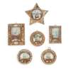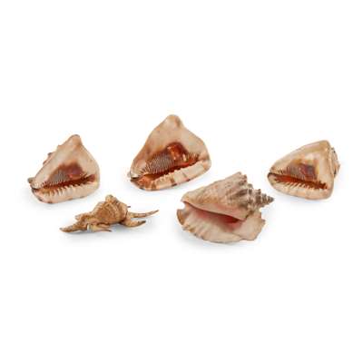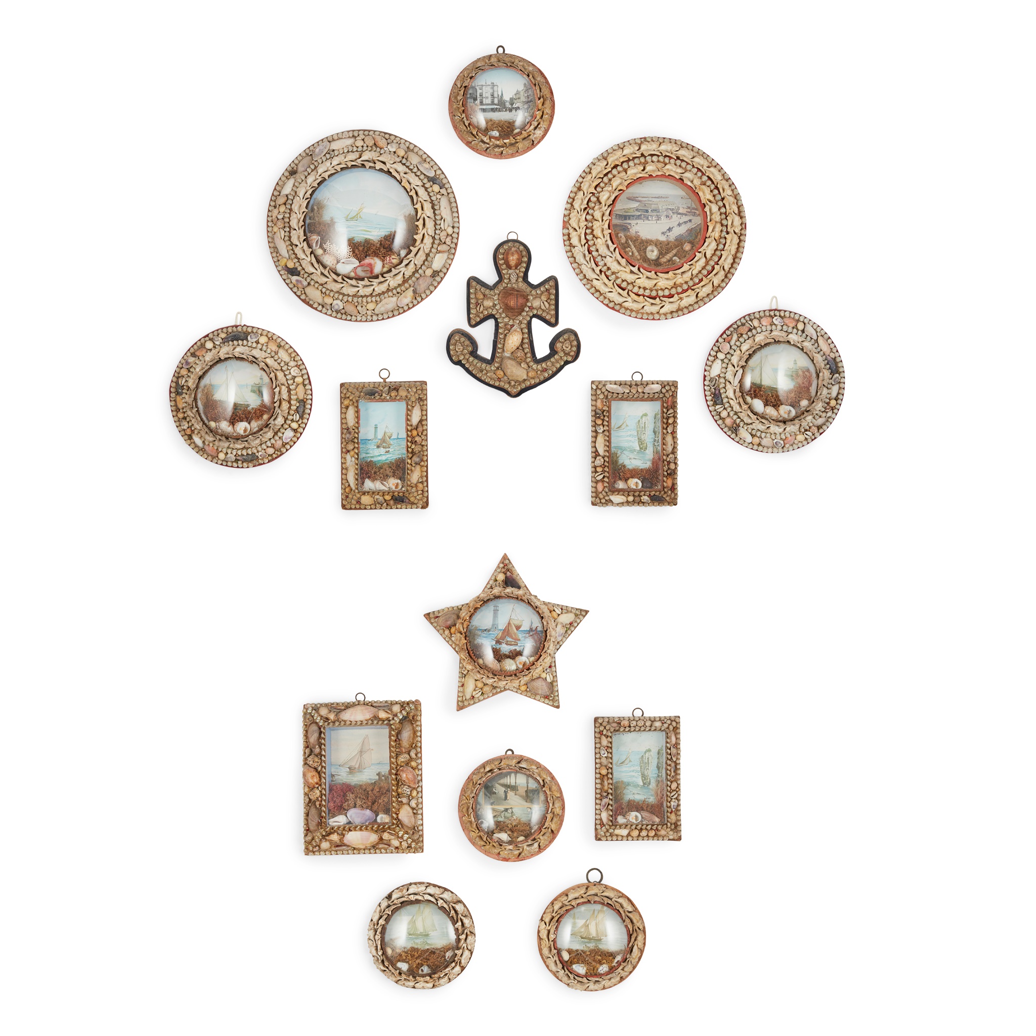 to include nine porthole examples, most with convex glass covers, one on a star-shaped ground; four rectangular examples; and a shell-work souvenir in the form of an anchor; together with FIVE LARGE CONCH SHELLS, largest 25cm wide