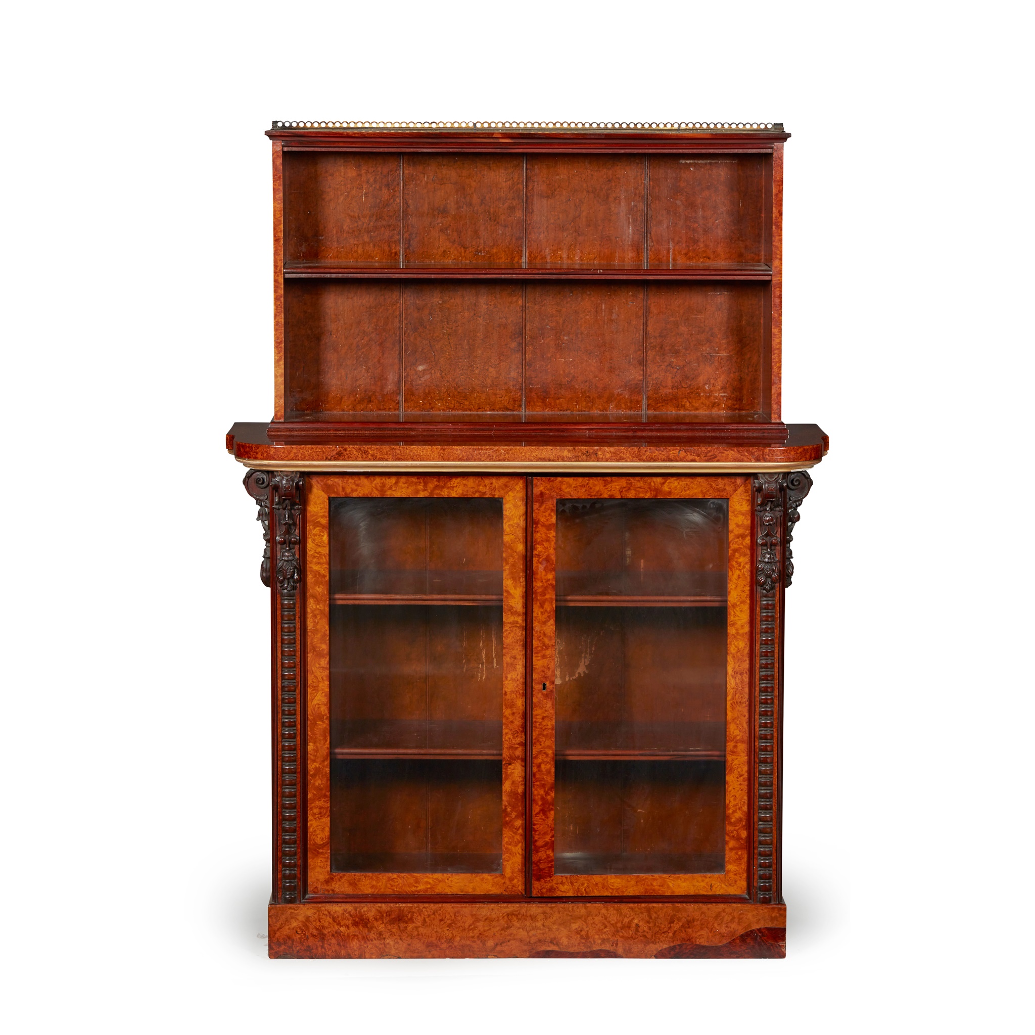 the superstructure with a fixed shelf and grass gallery; the lower part of bowfront outline with glazed doors flanked by bobbin and foliate carved mouldings, enclosing adjustable shelves, on a plinth base