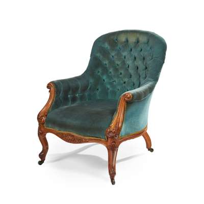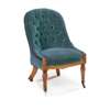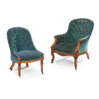 to include an armchair with a foliate carved frame on cabriole legs with brass castors; and a side chair with lotus carved legs with brass castors, both in blue velvet