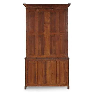 the foliate carved cornice above a pair of Gothic arch astragal glazed doors enclosing adjustable shelves; the base with twin panel doors enclosing adjustable shelves, on a plinth base