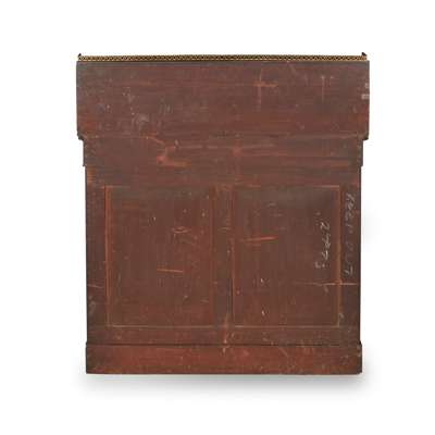 the brass galleried superstructure above a frieze drawer and pair of silk pleated doors flanked by columns