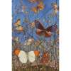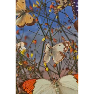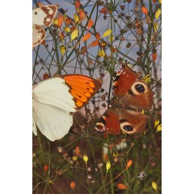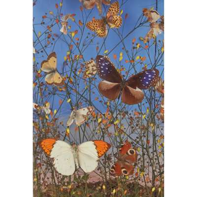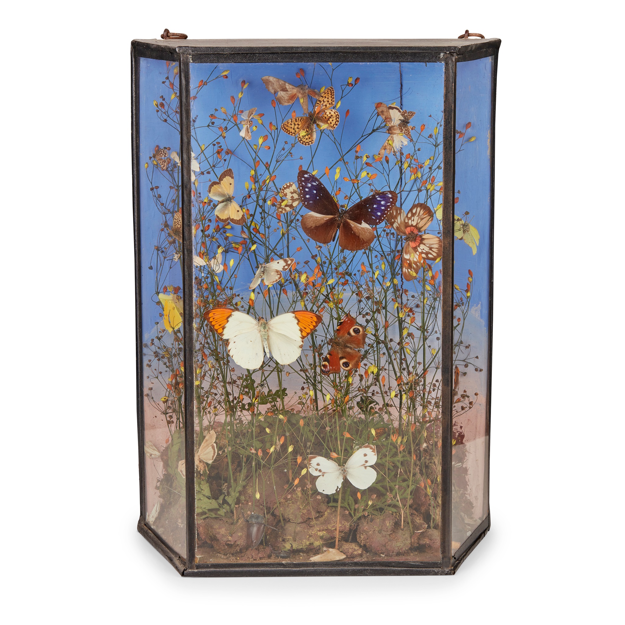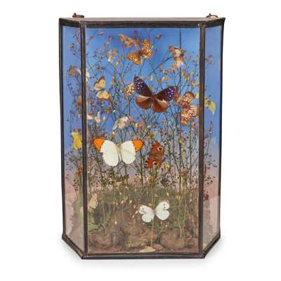 the glass case of three-sided canted form, mounted with various specimens including a peacock butterfly, an orange-tip butterfly and a cabbage white butterfly, set within foliage