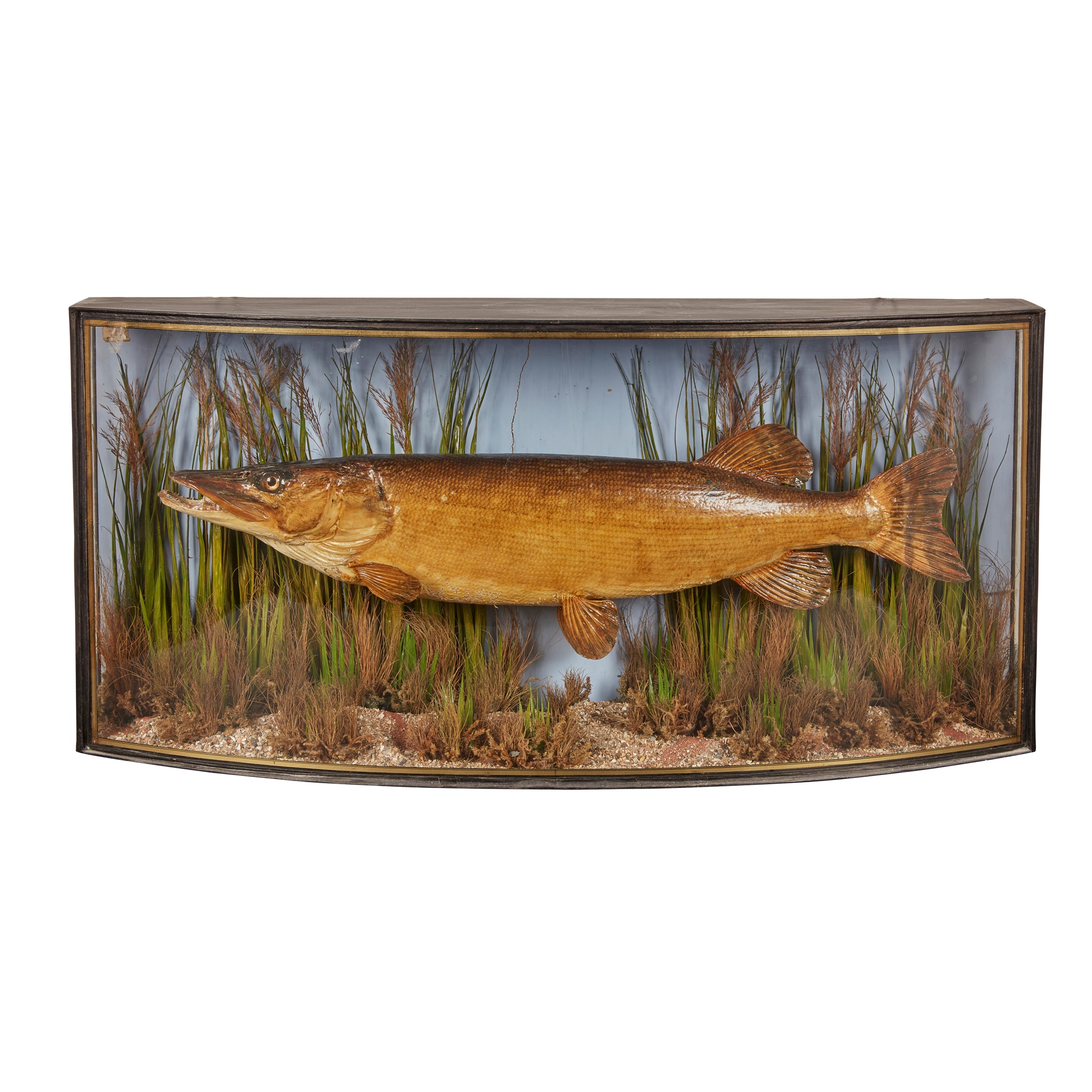 VICTORIAN BOWFRONT CASED TAXIDERMY DIORAMA OF A PIKE