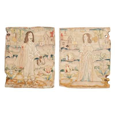 the linen ground embroidered with coloured silks, depicting a gentleman and a woman within landscape settings with buildings to the distance