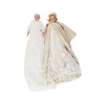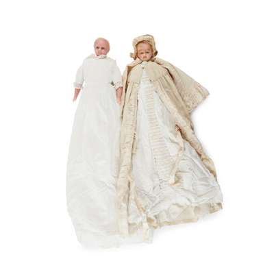 'Dulcie' and 'Evelyn', both shoulder plate dolls with inserted fair hair, fixed blue glass eyes, closed mouths, on cloth bodies with wax lower limbs, dressed