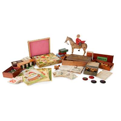 including Chandall's 'John Gilpin's Ride', in original box; set of John Jaques & Son 'Squails'; dominoes; marbles; 'Merelles'; various decks and games of cards; a group of trivia cards; and a block puzzle