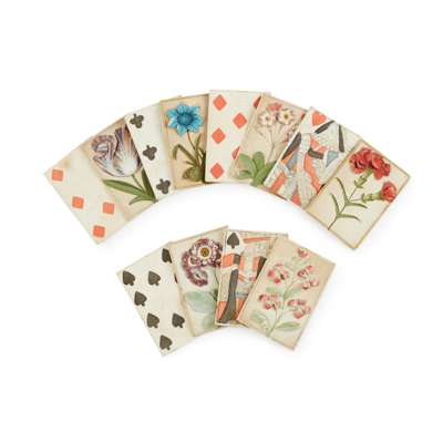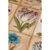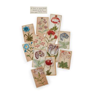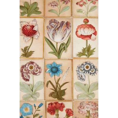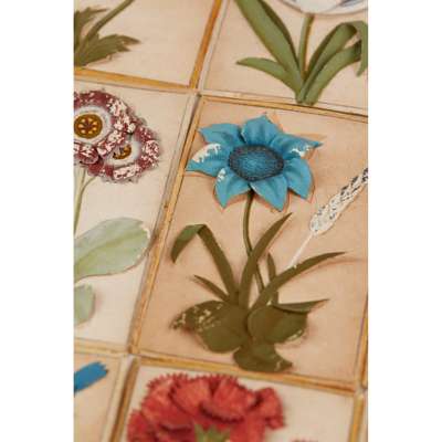 with applied painted paper cut-outs in the form of flowers, including auriculas, a tulip, carnations and a primula
