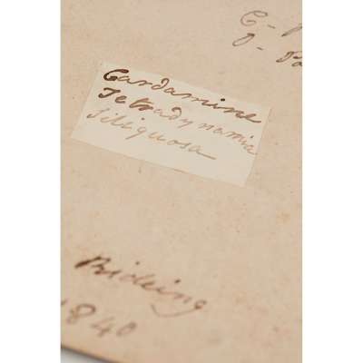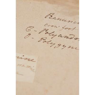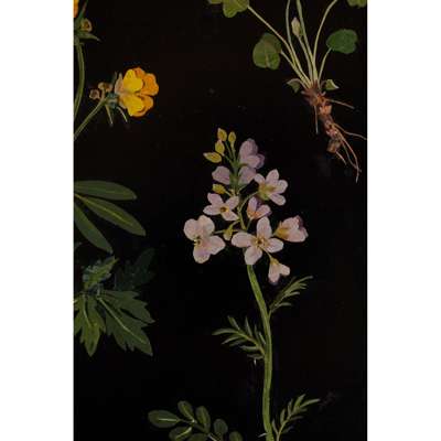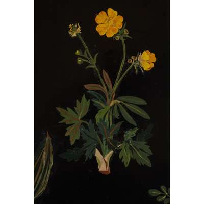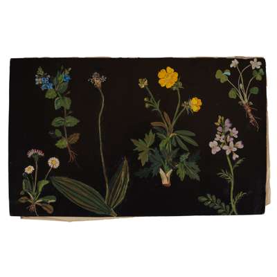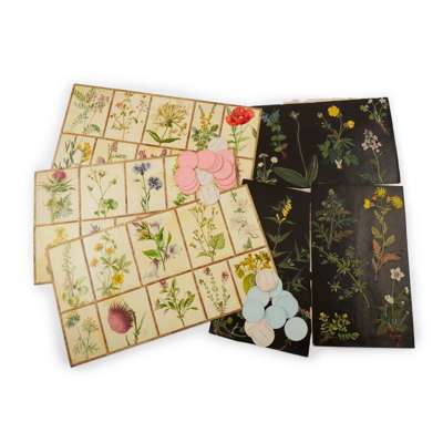 comprising 20 large cards with various printed botanical illustrations, with handwritten card counters, in a folio, each card 25cm x 45.5cm; together with THREE CARD COLLAGES, depicting painted flowers on black grounds, 33.5cm x 20.5cm