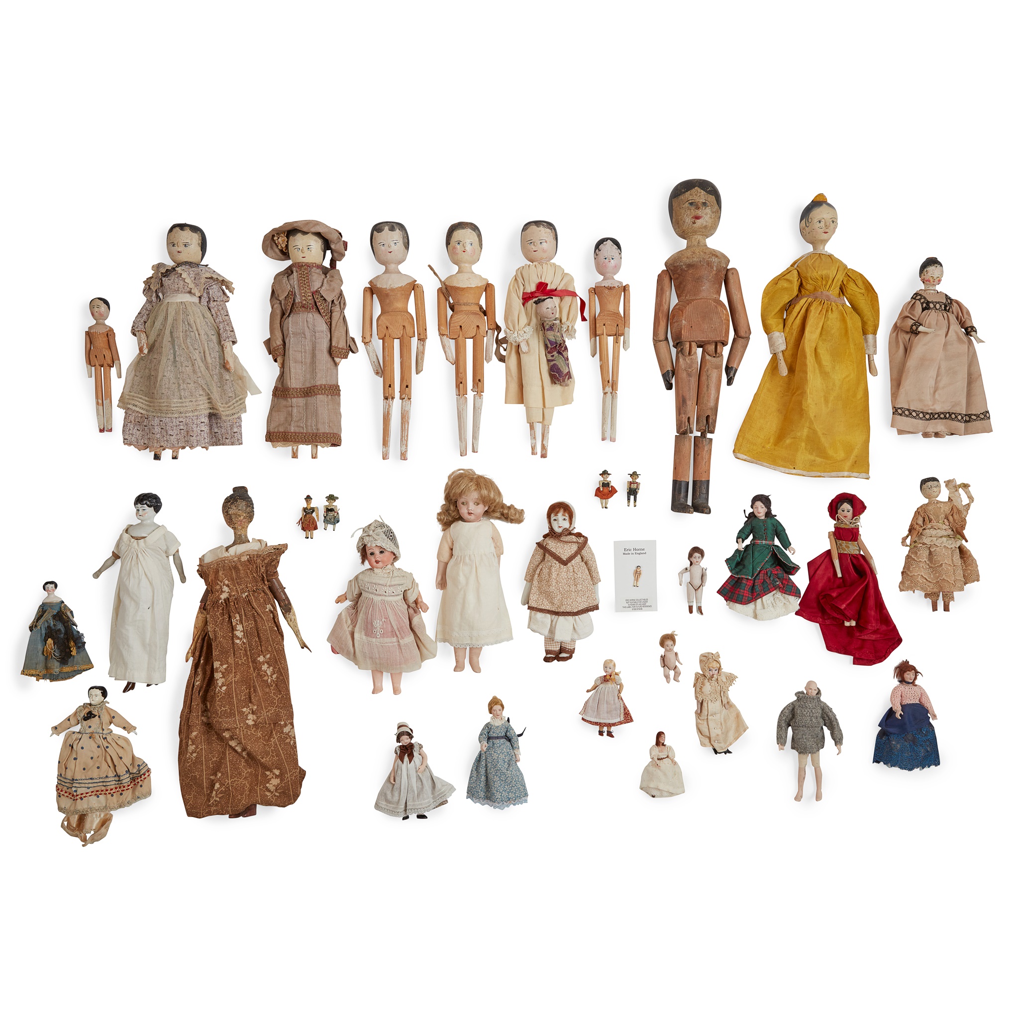 comprising various examples, including Grodnertal wooden dolls; china-headed dolls; German bisque-headed dolls; and dolls' house dolls, some in their original costume