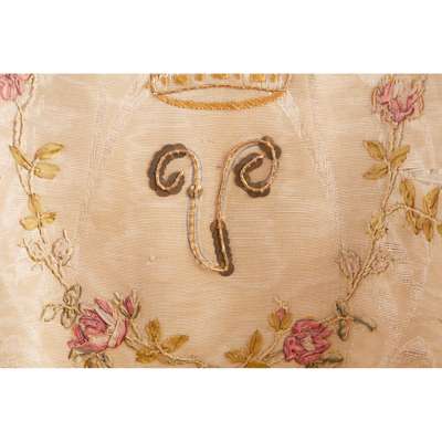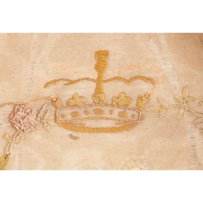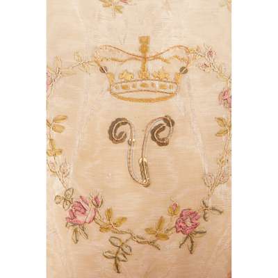 the curved enclosed back and arms ending in scrolled hand holds, with embroidered silk upholstery depicting flower sprays and garlands, enclosing a crown surmounting a V, on cabriole legs with claw and ball feet; together with John Abercrombie (1780-1844) M.D.'s certificate from the Royal College of Surgeons, dated 1823, with orange seal