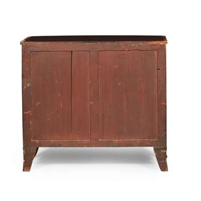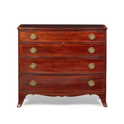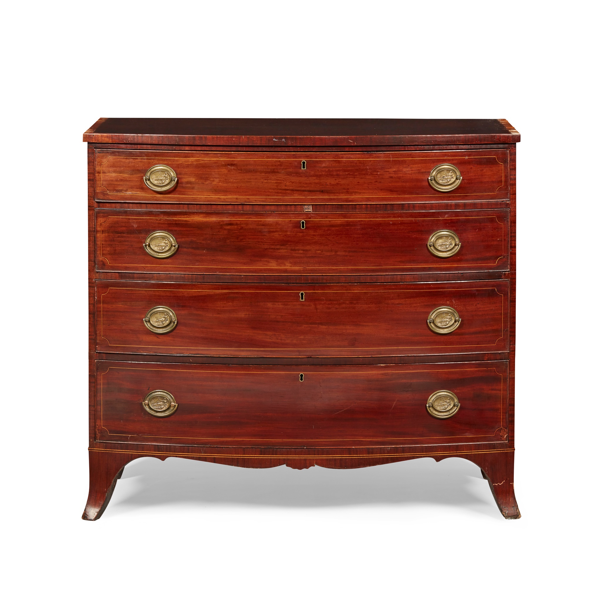 LATE GEORGE III MAHOGANY AND SATINWOOD BOWFRONT CHEST OF DRAWERS