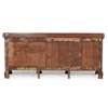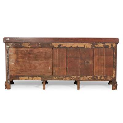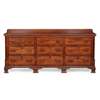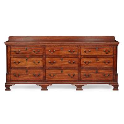 the top with a ledge back and moulded edge over an arrangement of nine short drawers, flanked by quarter columns, raised on ogee bracket feet