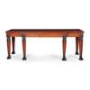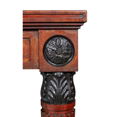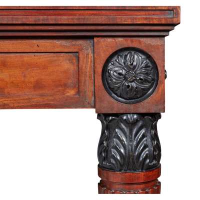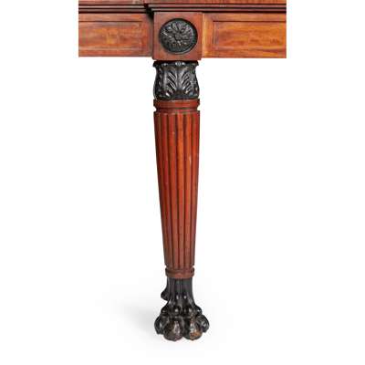the top over a plain panel frieze raised on boldly carved reeded and tapered legs headed by acanthus carved capitals and ending on large carved paw feet