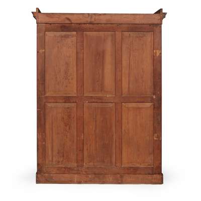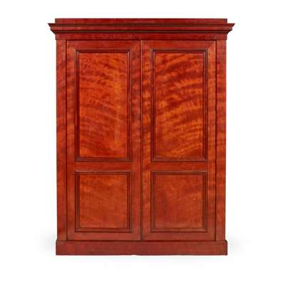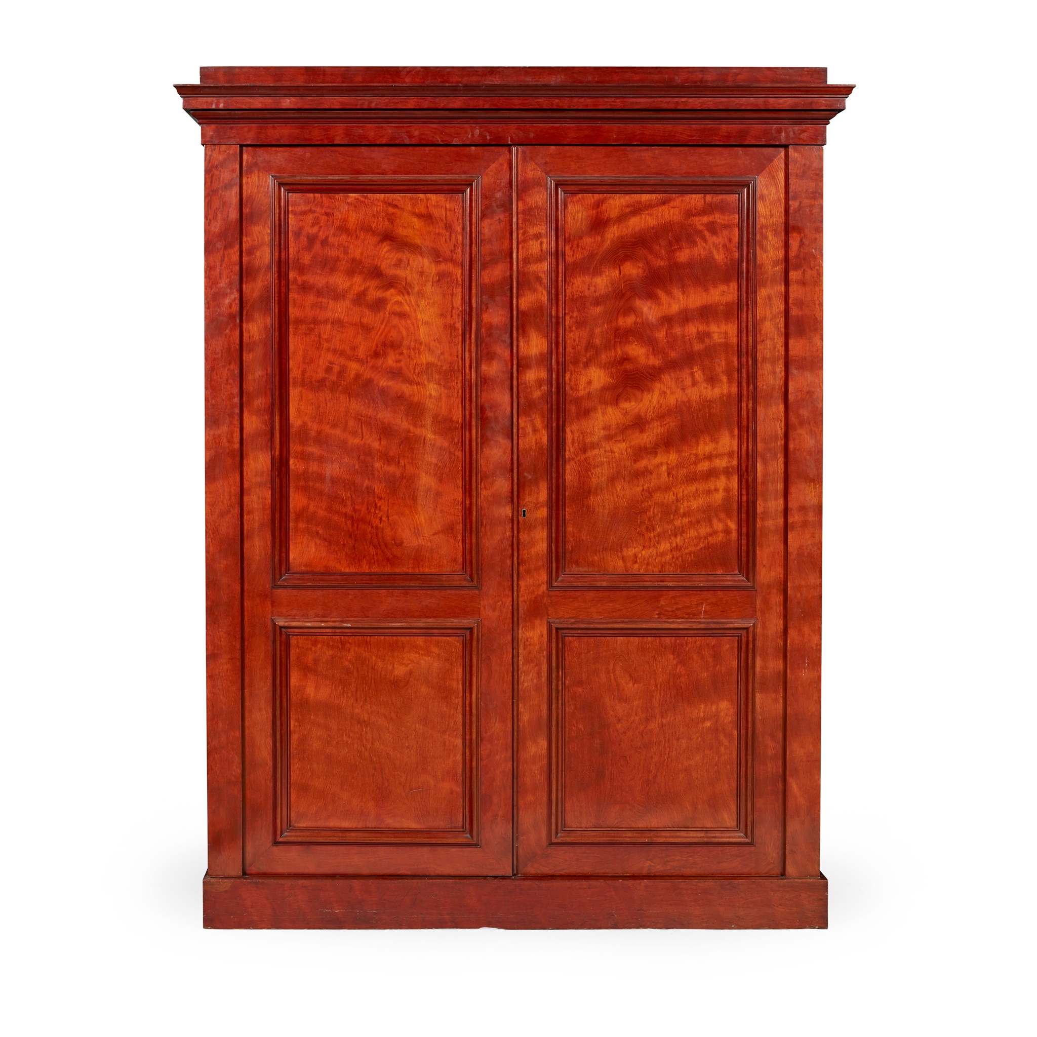 the moulded cornice above a pair of moulded panel doors opening to hanging space and drawers, on a plinth base