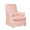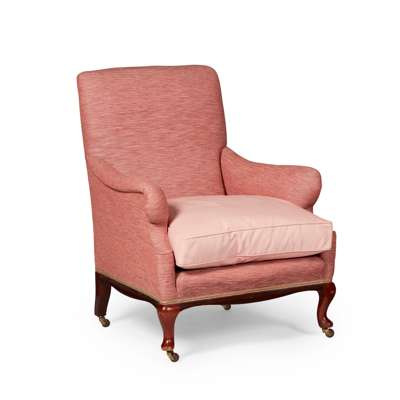 the square back above a loose cushion seat and low scroll arms, raised on cabriole legs with ceramic castors; covered in wine red upholstery with a pink slipcover