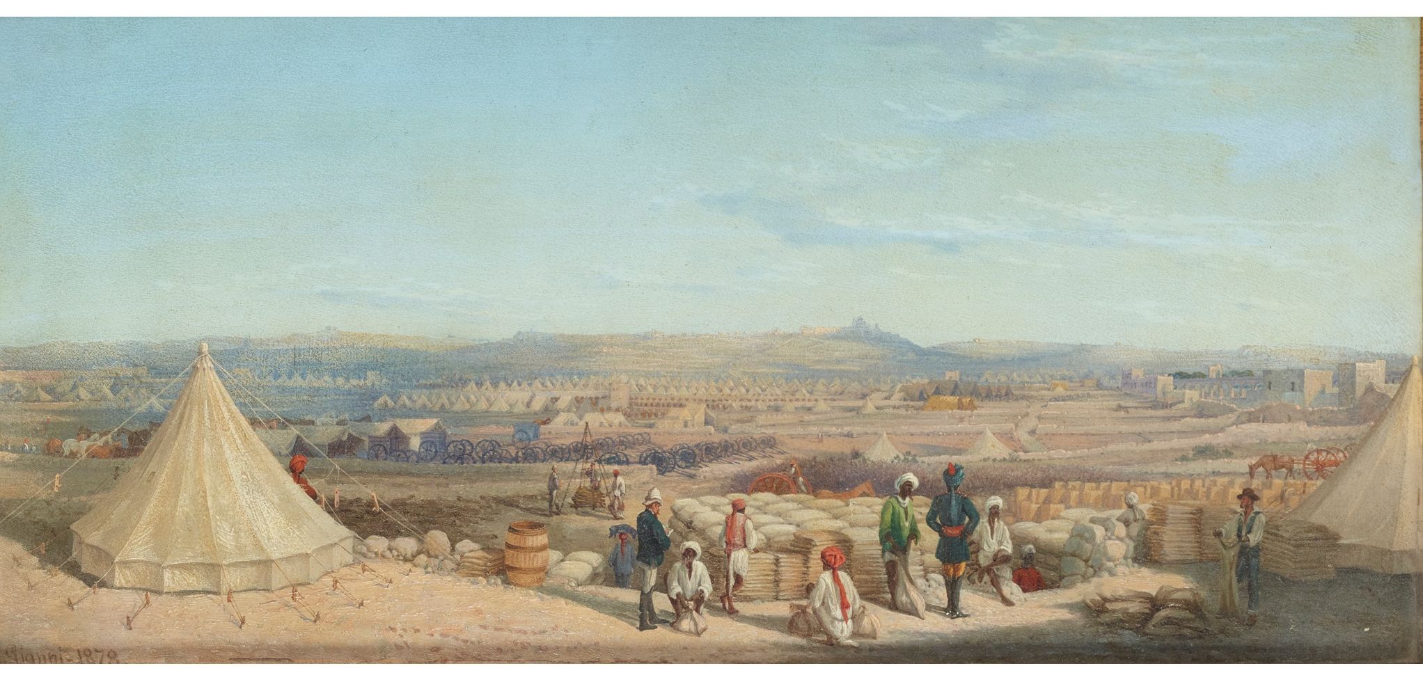 The main force arrived in Malta in May 1878, and soon set about preparing the camp and making new roads. The Artillery Camp and Indian Cavalry Camp at San Antonio, Attard portrays the scale of the operation, from the distant aisles of cannons to the troops industriously preparing sandbags and drawing water. Soldiers also engaged with weapons-training and sports, and they enjoyed learning more of Maltese culture and religion. Gianni alludes to engagement with Maltese customs by representing locals sporting the distinctive faldetta in the foreground of The Infantry Camp at Lazaretto, Malta.