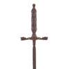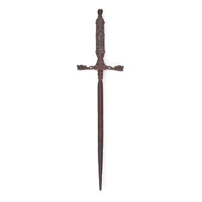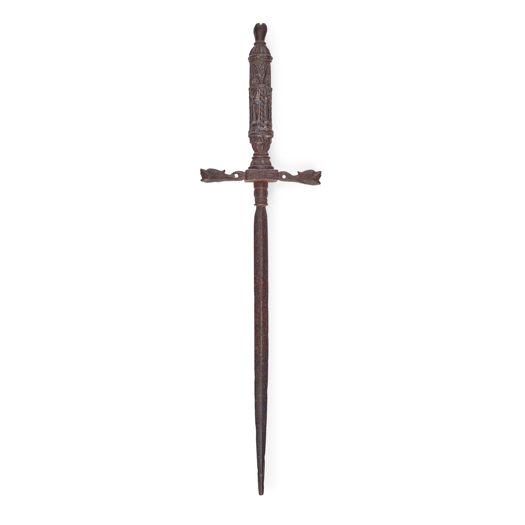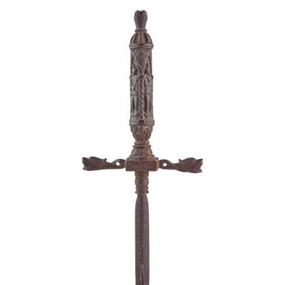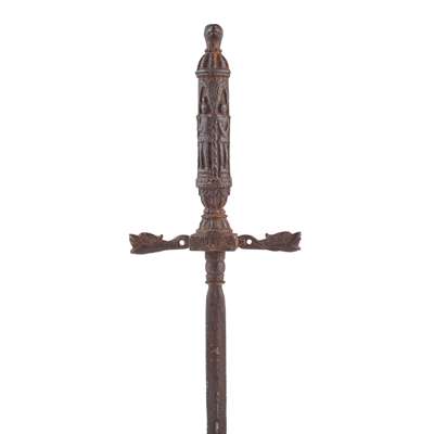 with cast grip forming of a series of classical figures in six niches with an animal head pommel and pierced cross guard, with grotesque head terminals and a double-edge narrow tapering blade