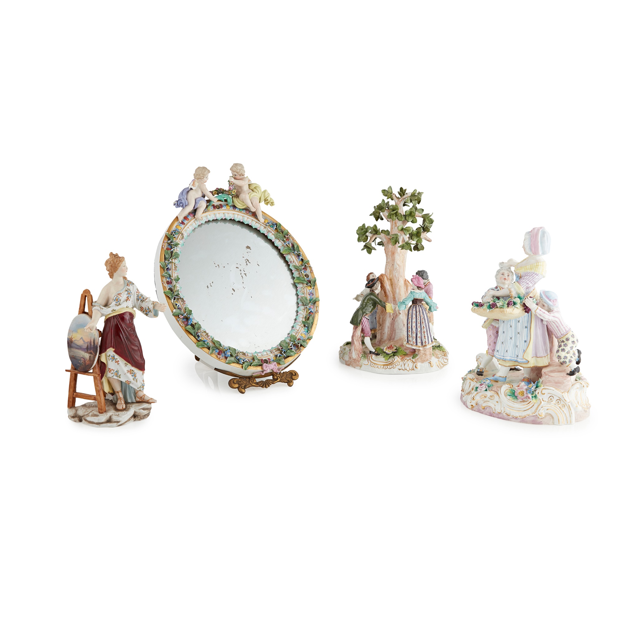 to include three Dresden Meissen style figure groups; together with a MEISSEN FOLIATE ENCRUSTED EASEL MIRROR