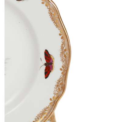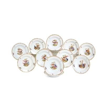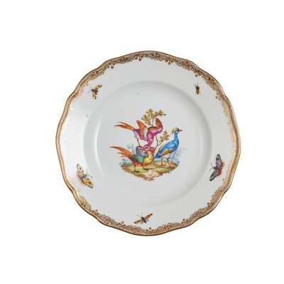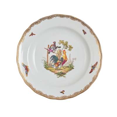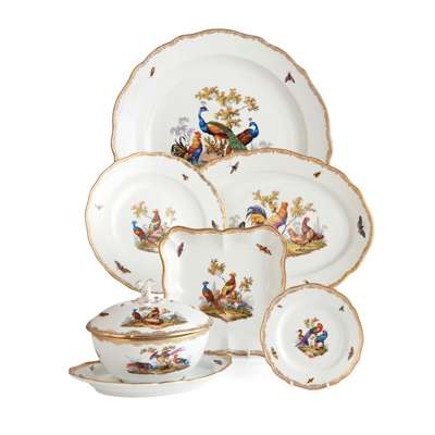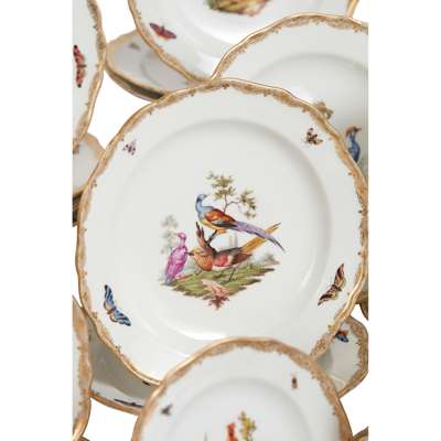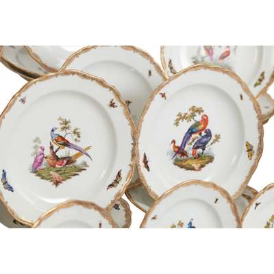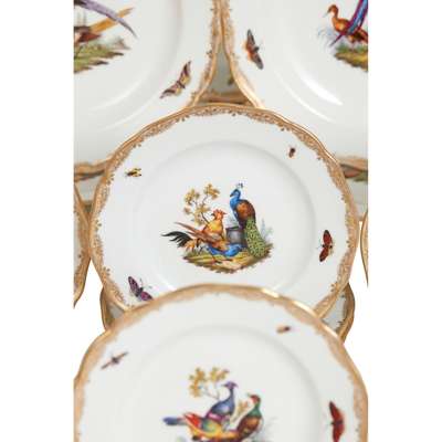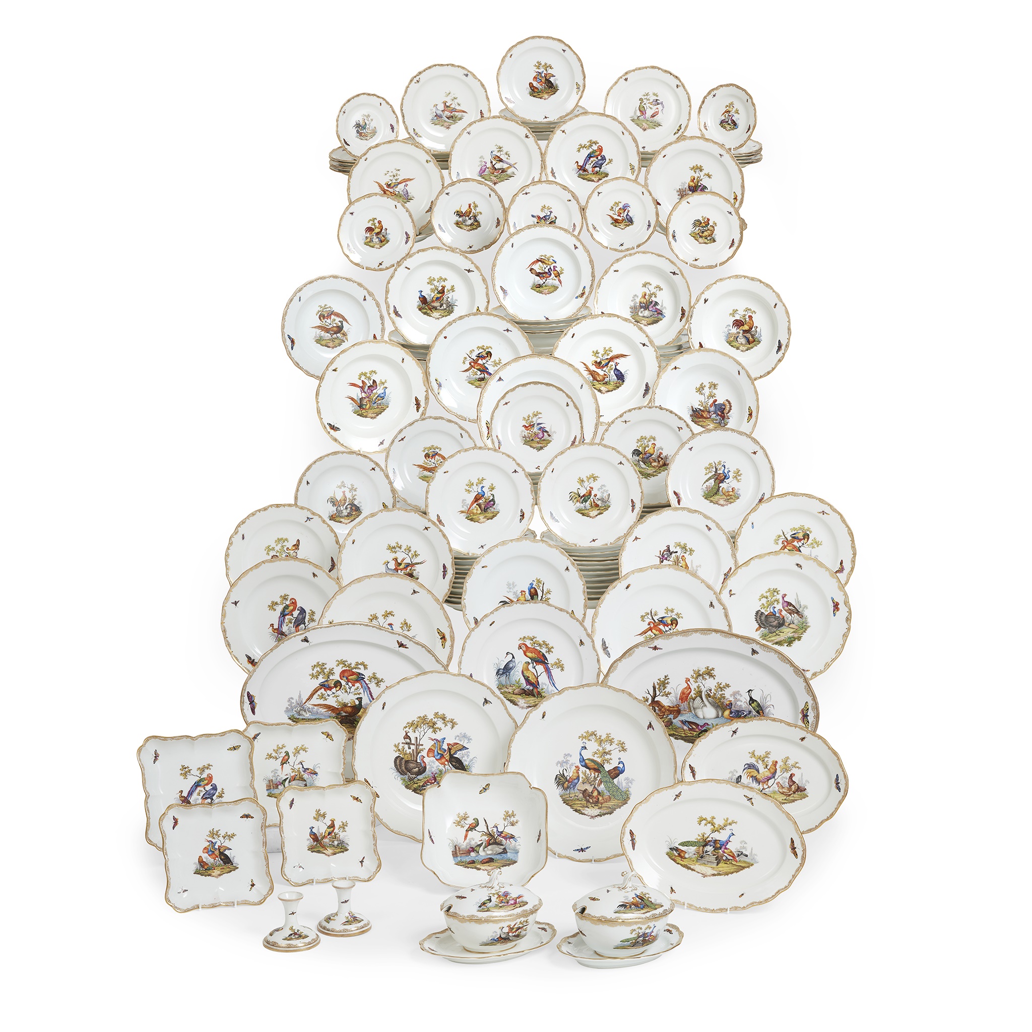 painted with vignettes of various birds, domestic, exotic and wild fowl, perched on branches and in naturalistic settings, with insects painted to the borders, within gilt rims; comprising: sixty five dinner plates, 23.5cm diam.; twenty one plates, 20.5cm diam.; twenty two side plates, 15cm diam.; twenty three bowls, 23.2cm diam.; two large scallop rimmed dishes of square form, 23cm wide; two smaller scallop rimmed dishes of square form, 19.5cm wide; a large bowl of square section form, 25cm wide; two oval tureens with covers and on integrated stands, 27cm wide; two large oval serving platters, 51.5cm wide; two smaller oval serving platters, 35cm wide; three large round serving dishes, 39cm diam., 39cm diam. and 34cm diam.; four small round serving dishes, 19cm diam.; two comport stands (one repaired, both tops lacking), 9.2cm high, underglaze blue crossed swords marks, all slightly ground down to the centre, various impressed and incised numerals